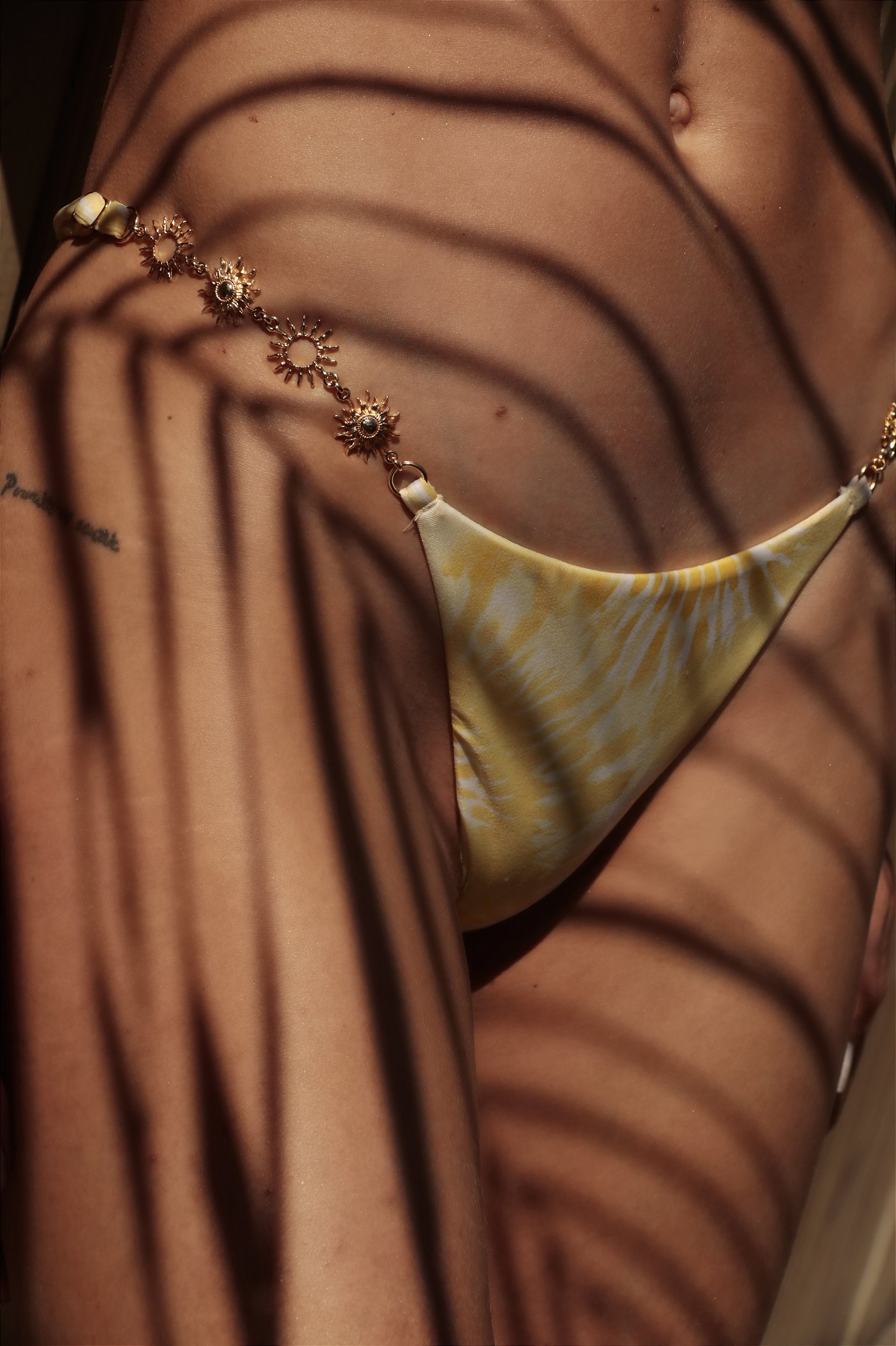 Estampa autoral tie-dye amarela, inspirada em raios solares suaves que trazem o espírito quente do verão. O desenho cria um movimento delicado e orgânico, reforçando a sensualidade natural e o clima vintage que inspiram a coleção.